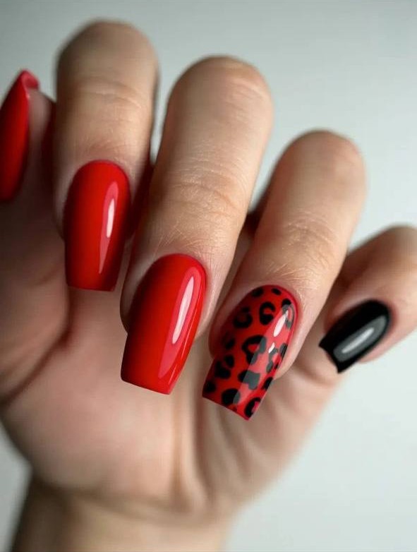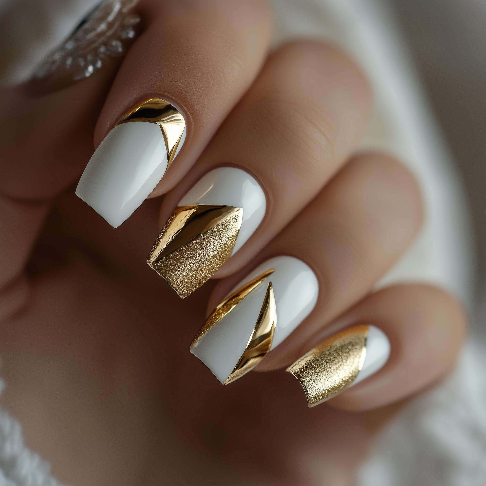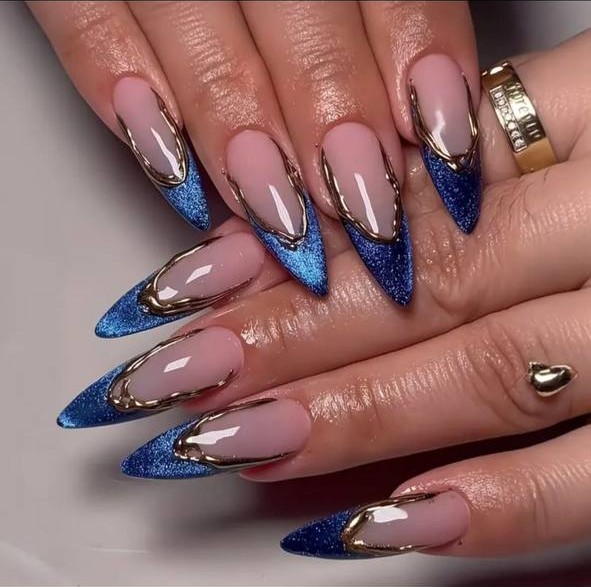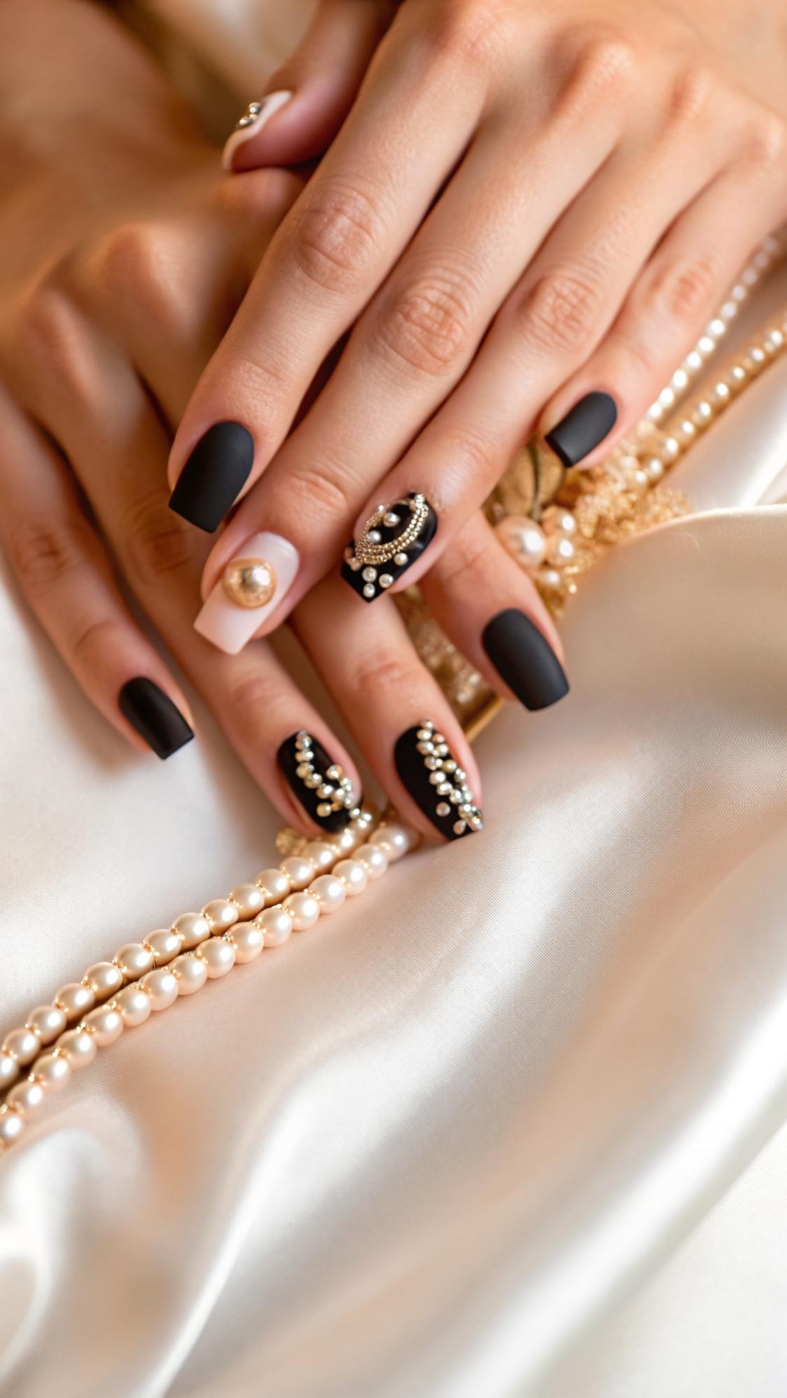 Luxury pedicure with black and gold lacquer on women’s toes on the black and brilliant background.